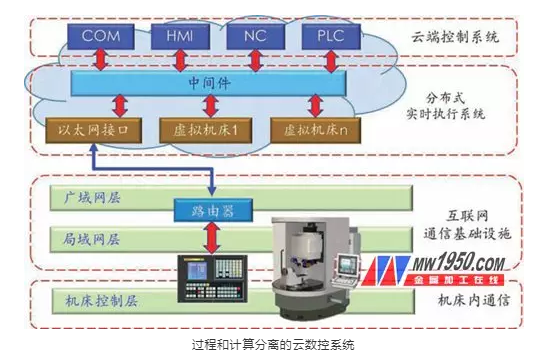 智能工廠的數(shù)控機(jī)床和機(jī)器人等智能裝備的未來(lái)發(fā)展重點(diǎn)已經(jīng)不在硬件,感知外部環(huán)境和工況變化需要更加強(qiáng)大的計(jì)算能力、通信帶寬和速度,才能進(jìn)行實(shí)時(shí)控制,形成真正的信息物理融合系統(tǒng)。它的特點(diǎn)是將設(shè)備的控制分為計(jì)算和過(guò)程兩部分,把運(yùn)動(dòng)控制保留在本地,而將計(jì)算移到云端,在云端“克隆”相應(yīng)的虛擬設(shè)備,在云端進(jìn)行虛擬制造,如圖所示。
